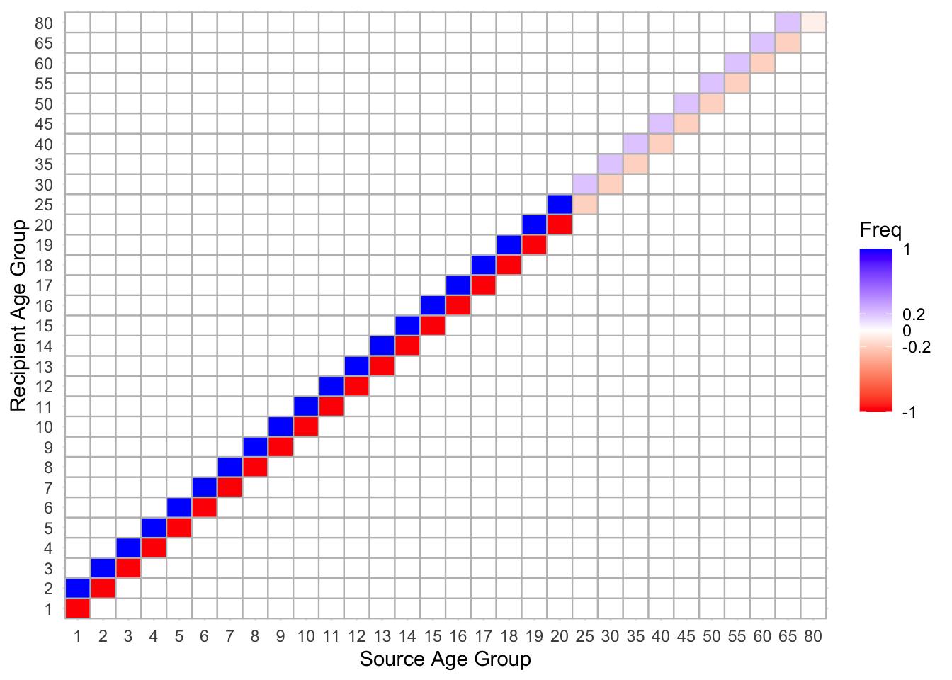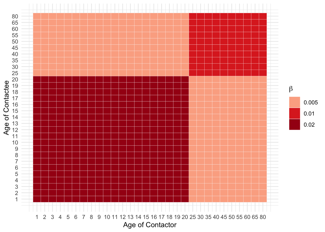 While this matrix tells us how many contacts are made per year by an individual of each age, it doesn’t tell us anything about the probability that a contact results in communication of infection. Let’s assume that each contact has a constant probability \(q\) of resulting in a transmission event.