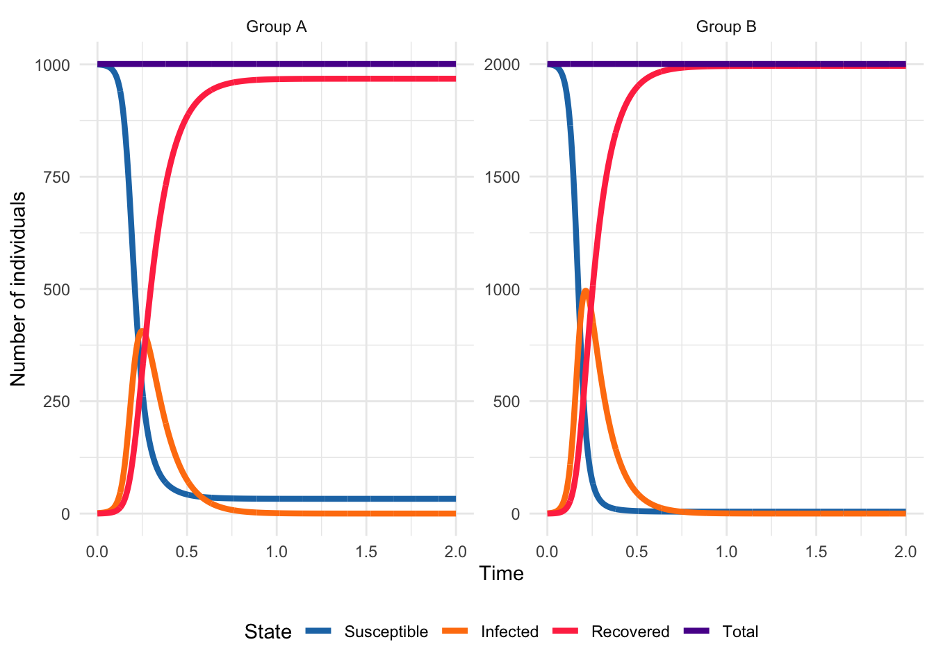 In this model, each population can infect each other but the infection moves through the populations separately. Let’s simulate such a model. To make things concrete, we’ll assume that the transmission rates \(\beta\) are greater within groups than between them.